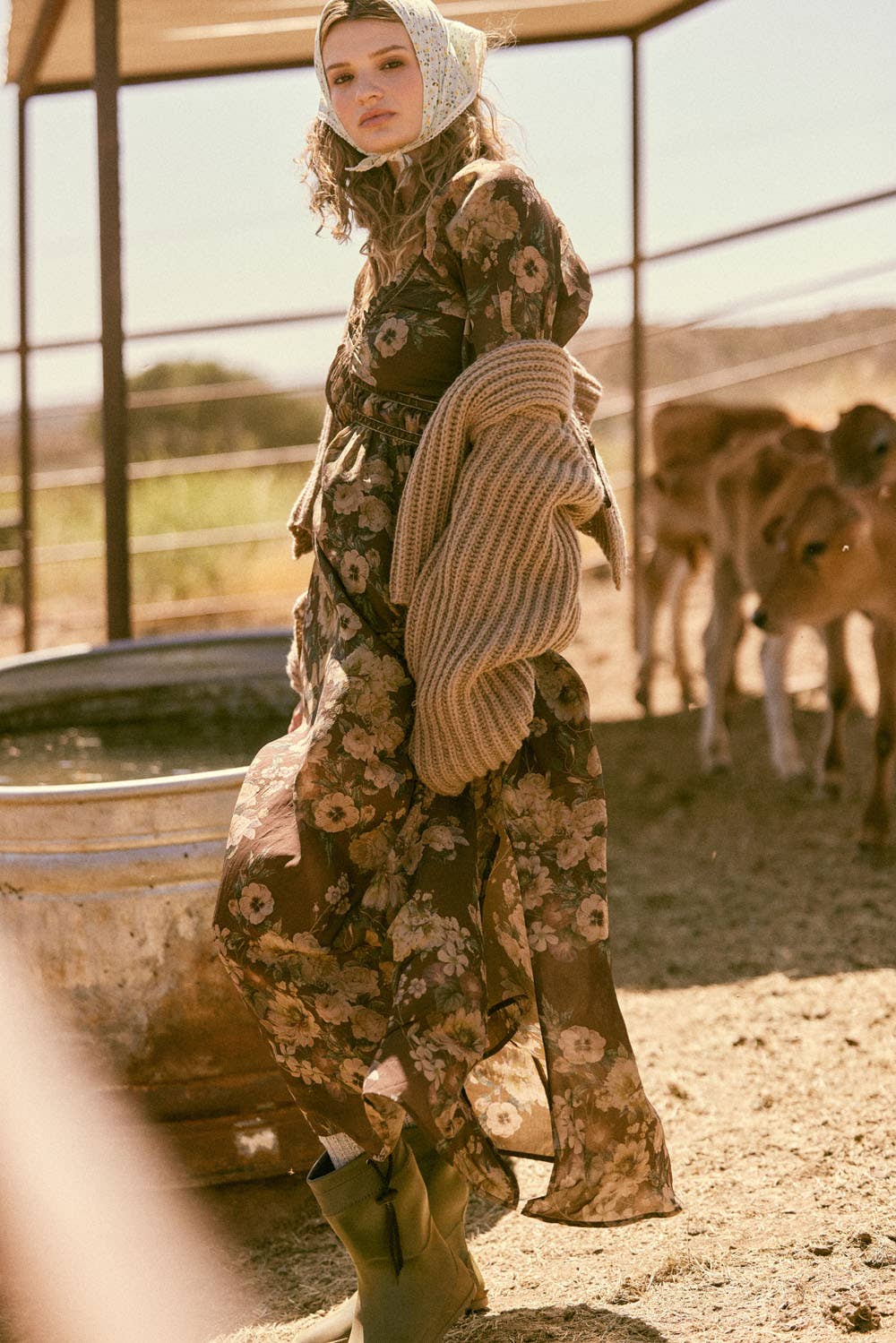 A floral-print chiffon maxi dress with the following features: V neckline with ruffle. Gathered bodice. Contrasting velvet trim. Long bubble sleeves with elastic cuffs. Low back with tie closure. Smocked elastic back. High waist. Sleeveless thigh-length lining. Ankle length. Relaxed fit.
